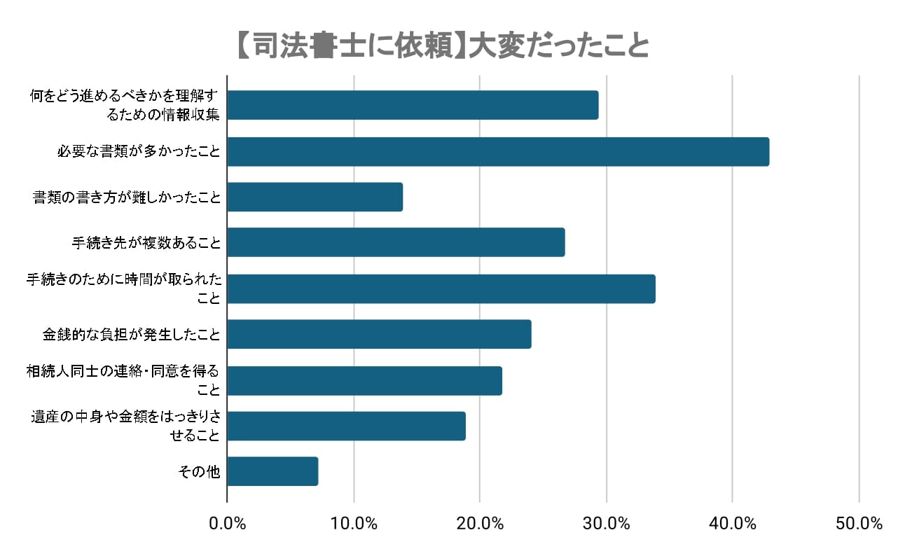 司法書士に依頼した人の中で、相続手続きにおいて最も多くの人が困難を感じたのは「必要な書類が多かったこと」(42.9%)でした。次いで「手続きのために時間が取られたこと」(33.9%)、「何をどう進めるべきかを理解するための情報収集」(29.3%)が続き、手続きに伴う書類の多さや時間的負担、情報収集の難しさが主な悩みとして挙げられています。