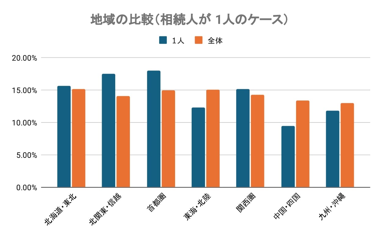 地域ごとに相続人が1人になるケースを比較すると、比較的多い地域は、首都圏(18.01%)、北関東・信越(17.54%)、北海道・東北(15.64%)でした。相続人が1人になるケースが少ない地域は、九州・沖縄(11.85%)、中国・四国(9.48%)でしたが、大きな差はなく、どの地域でも発生していることがわかりました。
