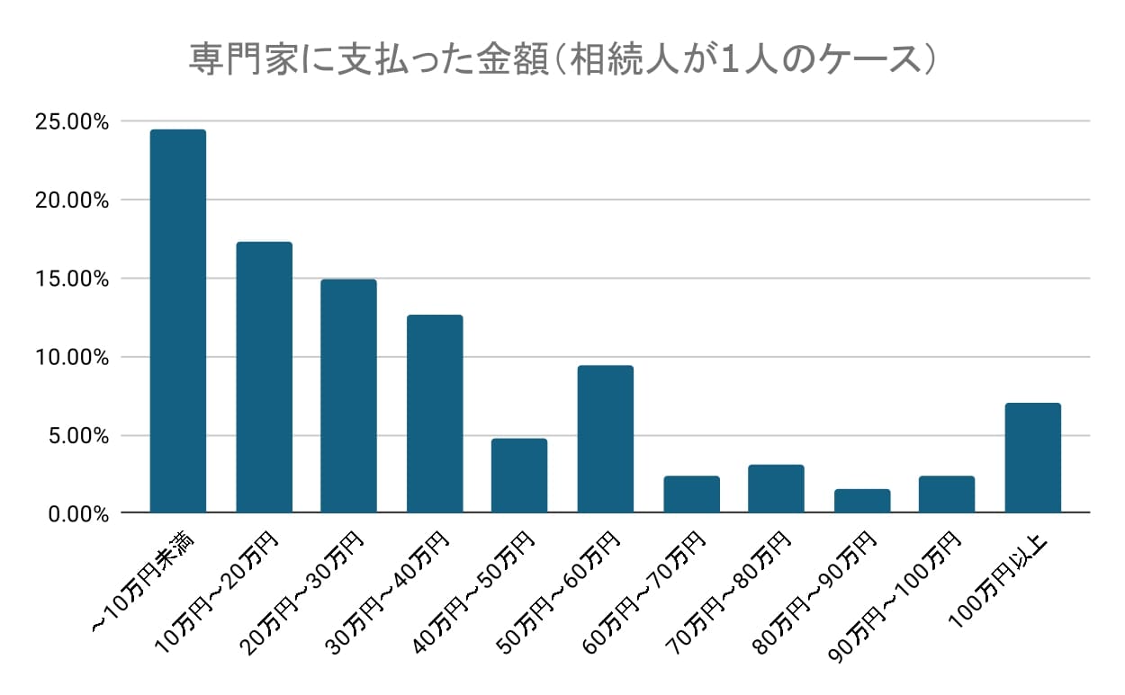 最も多いものから、10万円未満(24.41%)、10万円~20万円(17.32%)、20万円~30万円(14.96%)という順番でした。これらを合計すると56.69%で、30万円以下であった人が半数以上を占めました。一方、50万円以上の人を合計すると28.98%と、約3割が高額費用を支払っていることがわかります。相続税がかかる財産が多いケースや、不動産が複数ある場合は高額になりやすい傾向があります。
