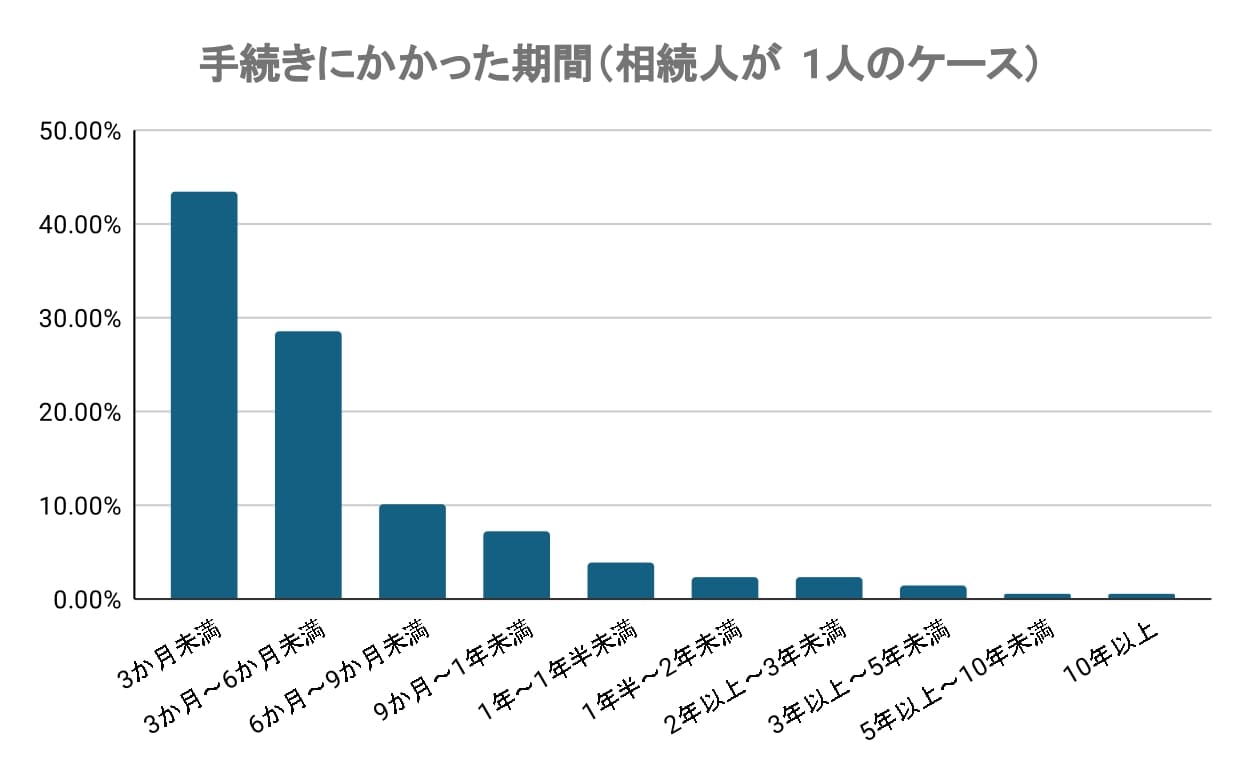 手続きにかかった期間は、3か月未満(43.33%)、3か月~6か月未満(28.57%)と、約7割(71.90%)が半年以内に相続手続きが完了していることがわかります。相続人が1人であるため、遺産分割協議などが不要であり、比較的スムーズに進みやすいことが背景にあると考えられます。6か月~9か月未満(10.00%)、9か月~1年未満(7.14%)と、6か月~1年かかるケースも一定数存在することから、相続税の申告期限は「相続開始から10か月以内」のため、税理士に依頼した相続税申告が関与している可能性があります。