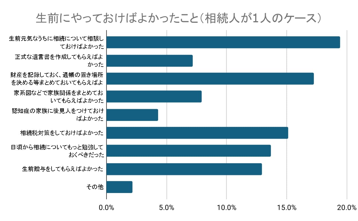相続人が1人のケースでは、手続きが比較的シンプルながらも、書類の多さや手続き先の多さが負担との回答が目立ち、半数程度は専門家へ手続きを依頼しています。生前に財産整理や相続の相談をしておけばよかったとの後悔があったようです。