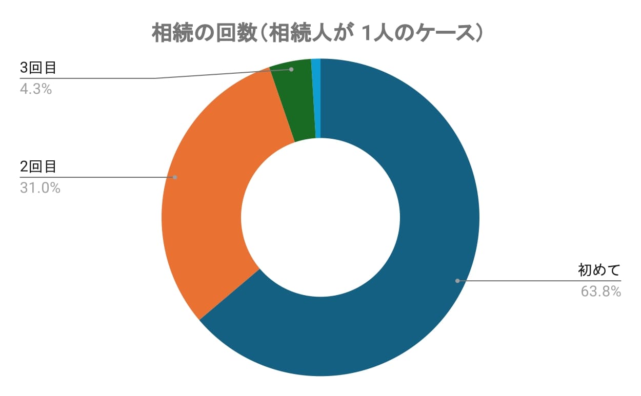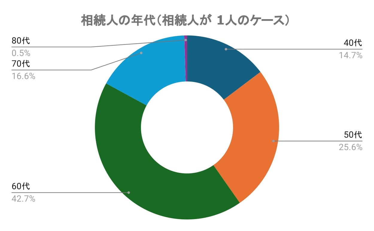 相続人が1人のケースにおいて、その相続人の年代分布は、60代(42.65%)が最も多く50代(25.59%)、70代(16.59%)、40代(14.69%)と続きました。80代以上(0.47%)は極めて少ないため、日本では相続が発生するのは主に50代~60代であることが分かります。70代も一定数あることから、親の寿命が長くなり、相続が発生するタイミングが後ろ倒しになっているためと考えられます。