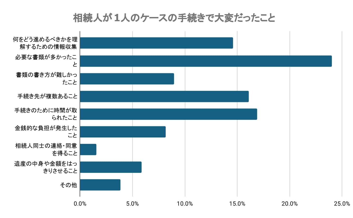 相続人が1人のケースの相続手続きで大変だったこととして、必要な書類が多かったこと(24.0%)、手続きのために時間が取られたこと(16.9%)、手続き先が複数あること(16.1%)が多く回答されました。何をどう進めるべきかを理解するための情報収集(14.6%)が大変だったと感じた人も比較的多い回答でした。