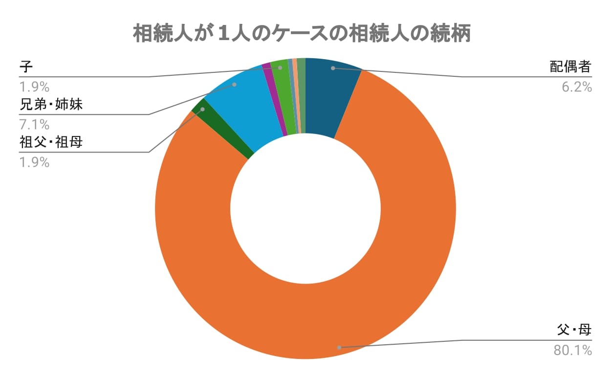 相続人の人数が1人の場合、最も多いのは「父・母」の相続であり全体の80%以上を占めています。配偶者が亡くなって相続人が1人となるケース(6.16%)は少数でした。子供がいない夫婦で配偶者が亡くなった場合、被相続人の親や兄弟姉妹が法定相続人になるため、配偶者単独での相続が少ないと考えられます。兄弟姉妹が相続するケース(7.11%)が一定数あることから、被相続人に配偶者も子も親もいない場合があったことがわかります。