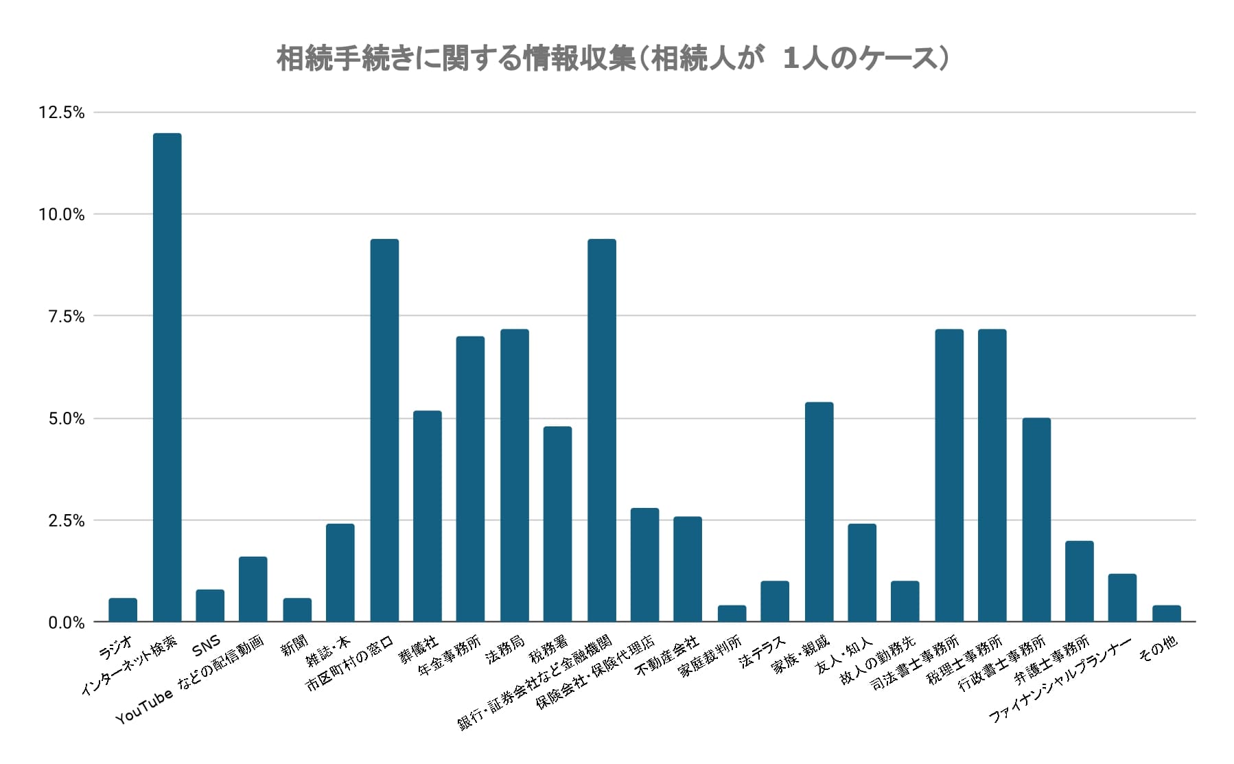 相続に利用した・役に立った情報源としては、インターネット検索(12.0%)が最も高い割合を占めていました。市区町村の窓口(9.4%)、法務局(7.2%)、税務署(4.8%) など、公的な機関が一定数利用されています。司法書士(7.2%)、税理士(7.2%)、行政書士(5.0%)、弁護士(2.0%) などの専門家への相談も比較的多いことがわかりました。葬儀社(5.2%) や 銀行・証券会社(9.4%) も多く利用されているため、葬儀から相続手続きの流れの中で自然と関与することが多いと考えられます。