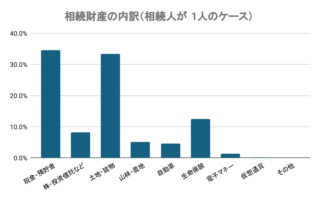 相続財産の種類は現金・預貯金(34.5%)と土地・建物(33.3%)がほぼ同程度の割合でした。生命保険(12.4%)、株・投資信託(8.2%)、山林・農地(5.2%)、自動車(4.7%)と続きました。電子マネー(1.4%)や仮想通貨(0.2%)は高齢者の資産としての普及率が低いため、相続時に引き継がれるケースが少ないと考えられます。