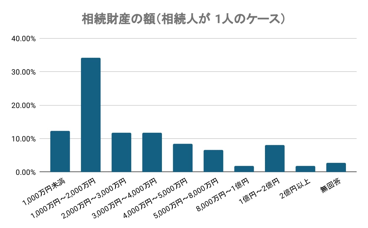 相続人が1人のケースの相続人の相続財産の額は、全体の約3分の1が1,000万円~2,000万円(34.12%)の範囲に集中しています。1,000万円未満が12.32%であることから相続財産が2,000万円未満のケースが全体の約46%を占めました。