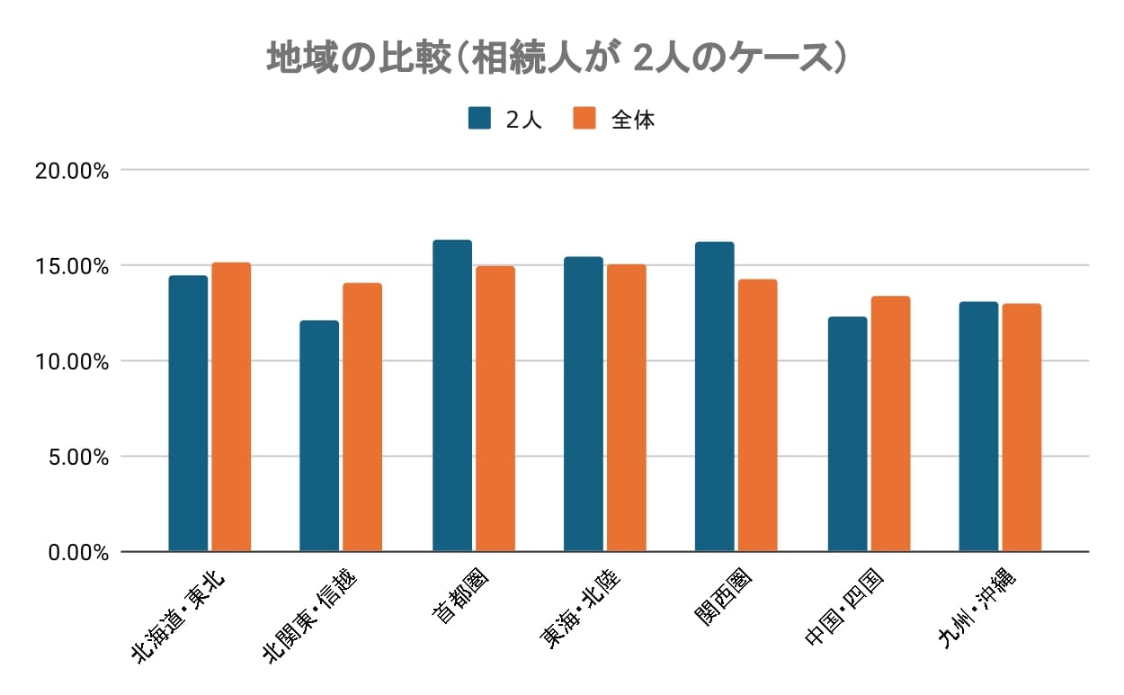 地域ごとに相続人が2人になるケースを比較すると、比較的多い地域は、首都圏(16.36%)、関西圏(16.20%)がほぼ同割合、東海・北陸(15.42%)、北海道・東北(14.49%)、九州・沖縄(13.08%)、中国・四国(12.31%)、北関東・信越(12.15%)という順でした。大きな差はなく、どの地域でも発生していることがわかりました。