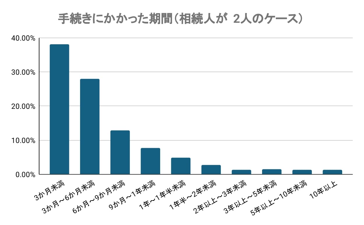 手続きにかかった期間は、3か月未満(38.13%)、3か月~6か月未満(27.97%)と、 3人に2人が6か月以内に相続手続きを完了しており、相続人が2人のケースでは比較的スムーズに手続きが進む傾向があると言えます。6か月~9か月未満(12.81%)、9か月~1年未満(7.81%)を含めると 86.72% となり、9割近くが1年以内に相続手続きを終えています。1年~1年半未満(4.84%)、1年半~2年未満(2.81%)、2年以上~3年未満(1.41%)、5年以上~10年未満(1.41%)、10年以上(1.25%) と長期化するケースもみられます。