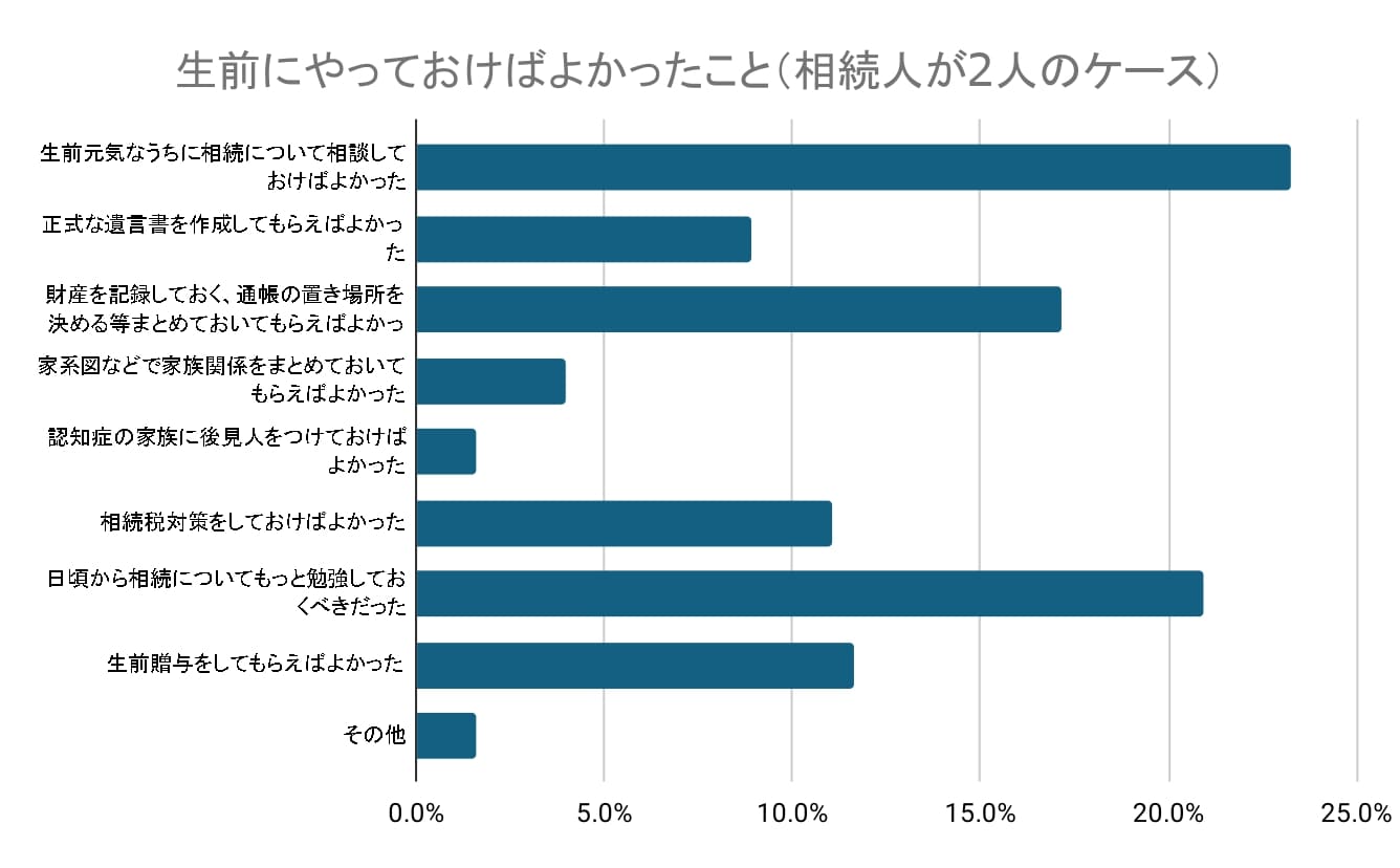生前にやっておけばよかったこととして、元気なうちに相続について相談(23.3%)と約4人に1人が「生前に相続について相談すればよかった」と感じていることがわかりました。もっと相続について勉強しておくべきだった(20.9%)との回答も高い割合を示しました。財産を記録・整理しておいてもらえばよかった(17.2%)という意見も多くみられました。相続税対策をしておけばよかった(11.0%)、生前贈与をしてもらえばよかった(11.6%) と節税に関する回答も一定数みられました。