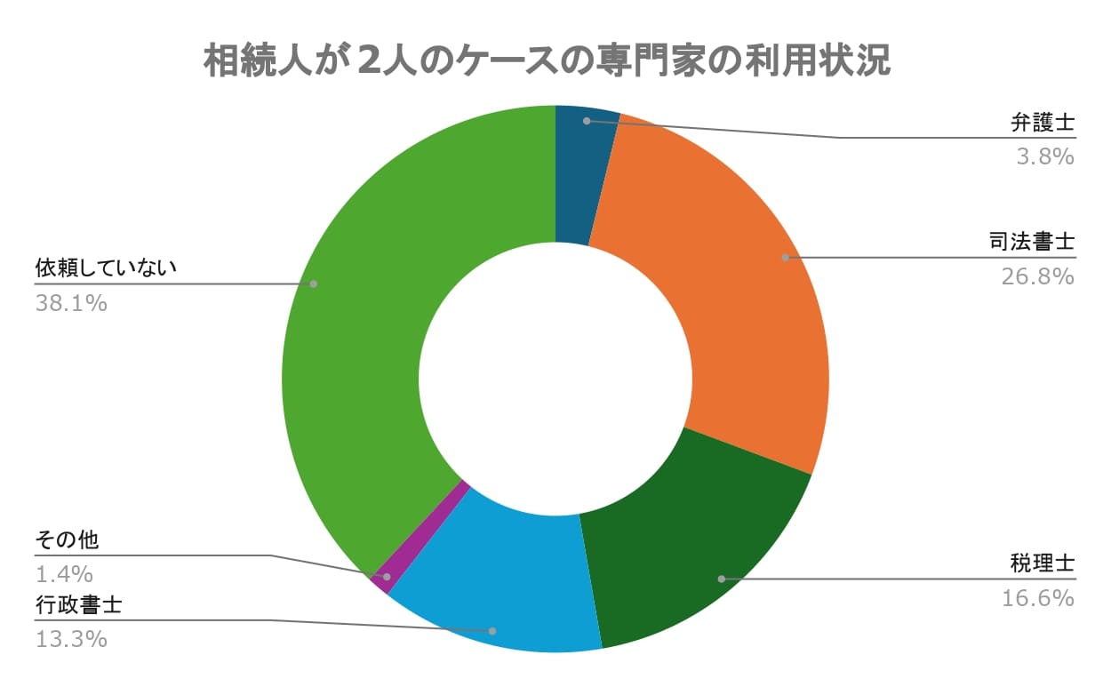 相続人が2人のケースでの専門家への依頼状況は、司法書士(26.8%)、税理士(16.6%)、行政書士(13.3%)の順で利用者が多く、弁護士はわずか3.8%でした。38.1%が専門家を依頼せずに手続きを完了していることがわかりました。