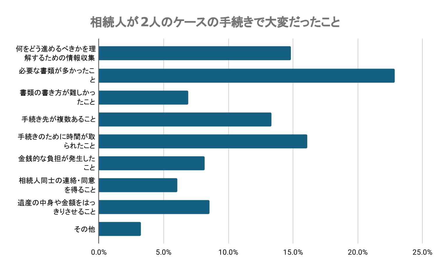相続人が2人のケースの相続手続きで大変だったこととして、必要な書類が多かったこと(22.8%)、手続きのために時間が取られたこと(16.1%)、手続き先が複数あること(13.3%)が多く回答されました。何をどう進めるべきかを理解するための情報収集(14.8%)が大変だったと感じた人も比較的多い回答でした。