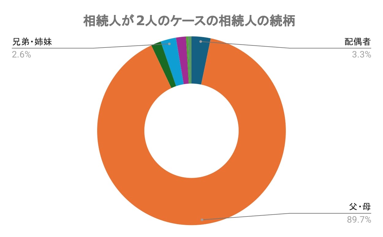 相続人の人数が2人の場合、最も多いのは「父・母」の相続であり89.72%を占めています。次に配偶者が亡くなって相続人が2人となるケース(3.27%)、兄弟・姉妹が亡くなって相続人が2人となるケース(2.65%)、叔父・叔母が亡くなって相続人が2人となるケースと祖父・祖母が亡くなって相続人が2人となるケース(1.71%)という順番でした。