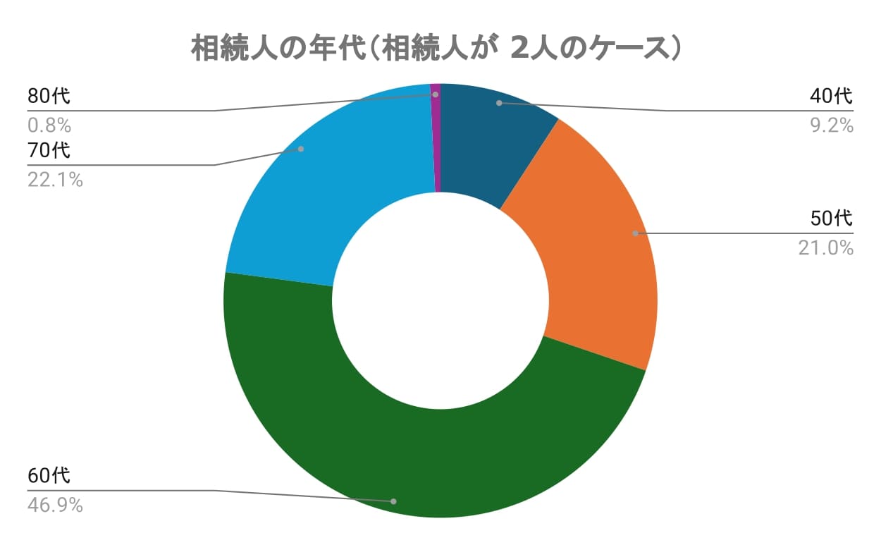 - 相続人が2人の場合、相続人の年齢は60代が最多(46.88%)。