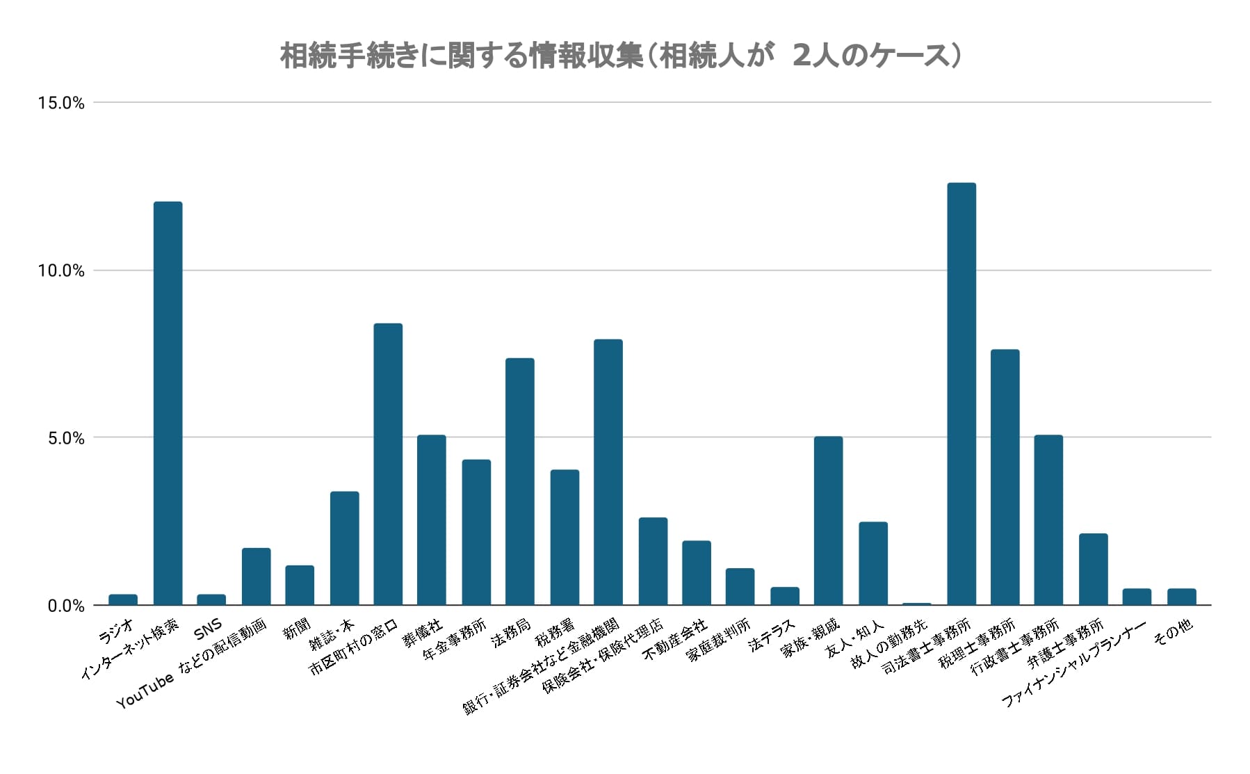 相続に利用した・役に立った情報源としては、インターネット検索(12.0%)が最も高い割合を占めていました。市区町村の窓口(8.4%)、銀行・証券会社など金融機関(7.9%)、法務局(7.4%)、税務署(4.8%) 、年金事務所(4.3%)など、公的な機関が一定数利用されています。司法書士(12.6%)、税理士(7.6%)、行政書士(5.1%)、弁護士(2.1%) などの専門家への相談も比較的多いことがわかりました。葬儀社(5.1%)も利用されているため、葬儀から相続手続きの流れの中で自然と関与することが多いと考えられます。