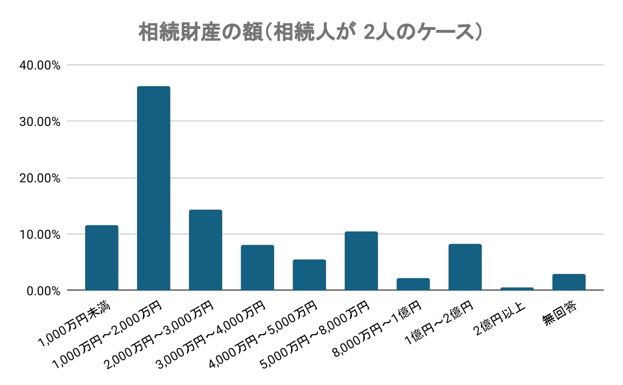 相続人が2人のケースの相続人の相続財産の額は、1,000万円~2,000万円(36.14%)が一番大きな割合を占めました。次に2,000万円~3,000万円(14.33%)、1,000万円未満(11.53%)、5,000万円~8,000万円(10.44%)がそれぞれ10%以上の割合がありました。1億円~2億円(8.26%)も一定数存在しました。