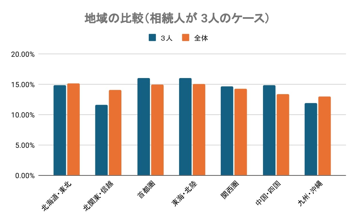 地域ごとに相続人が3人になるケースを比較すると、首都圏(16.05%)、東海・北陸(16.05%)が同割合で最多、北海道・東北(14.86%)と中国・四国(14.86%)が同割合で続き、関西圏(14.71%)、九州・沖縄(11.89%)、北関東・信越(11.59%)という順でした。大きな差はなく、地域による偏りはあまりないことがわかりました。