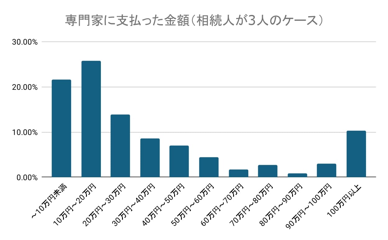 最も多いのが10万円~20万円(25.83%)、次に10万円未満(21.67%)で、約半数(47.5%)が20万円未満の支払いに収まっていました。50万円以上支払った人は全体の23.06%あり一定割合存在しました。費用が高額になるのは相続税がかかる財産が多いケースや、不動産が複数ある場合、弁護士費用がかかる相続争いがあった場合と考えられます。