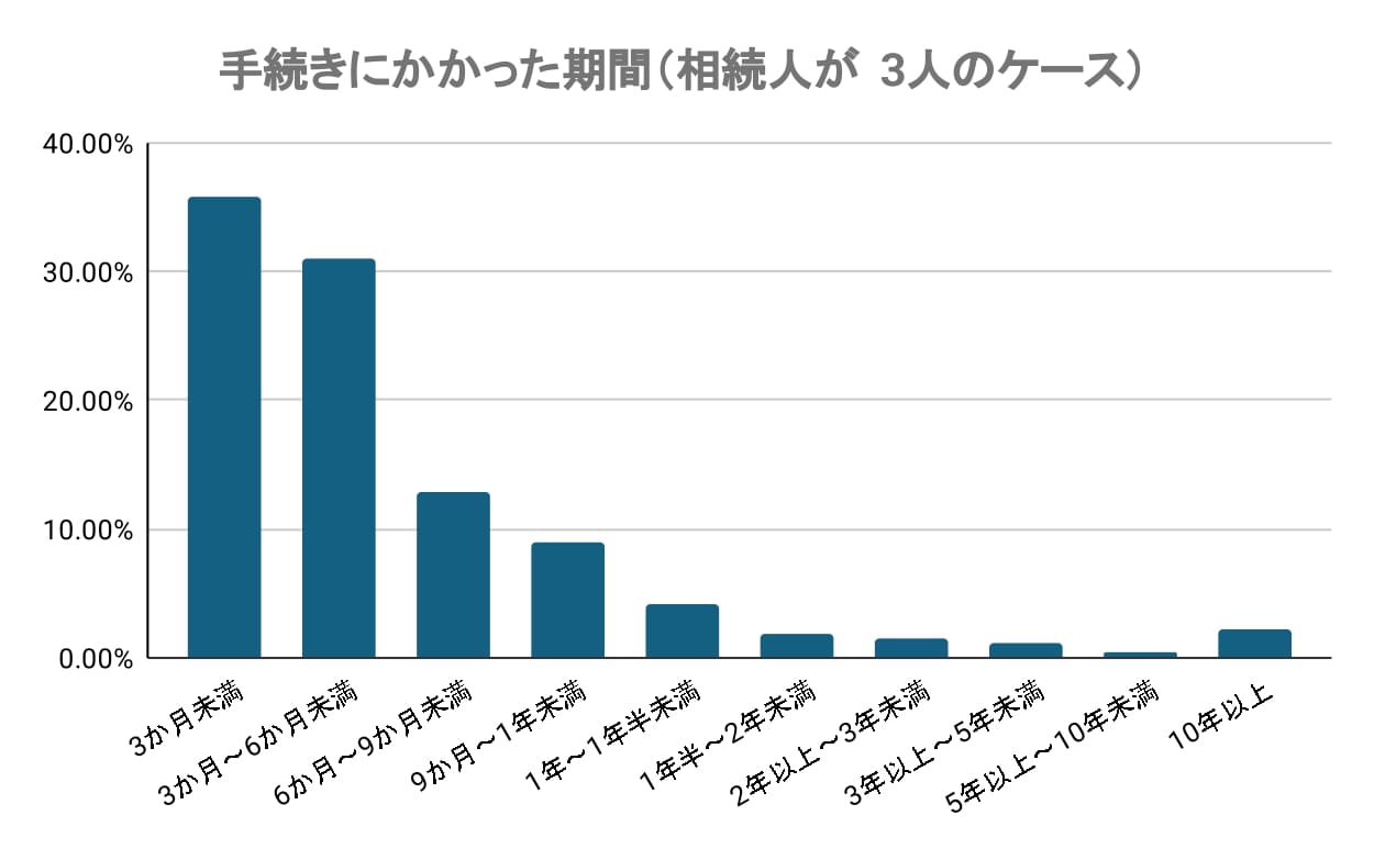 手続きにかかった期間は、3か月未満(35.86%)、3か月~6か月未満(30.95%)と、全体の66.81%が6か月未満で手続きを完了しています。1年以上かかった人は約11%と少数派ながらも存在しました。遺産分割協議がまとまらず、相続人間で揉めたり、相続財産が複雑(不動産が多い、海外資産など)な場合などは相続手続きが長期化する場合があります。