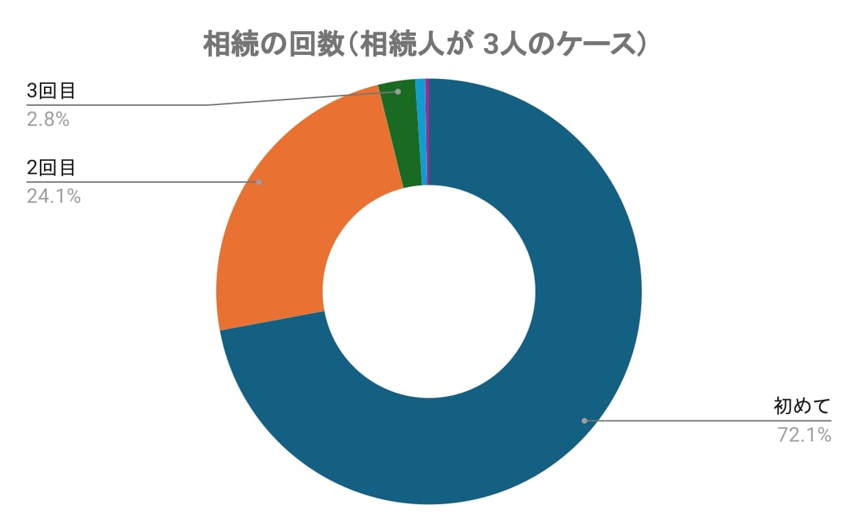 初めての相続が全体の約7割を占め、ほとんどの人にとって相続は初めての経験であることがわかります。2回目(24.07%)、3回目(2.82%)、4回目(0.74%)、5回目以上(0.30%)と、3回以上の相続経験者はごく少数であり、このことから、相続は一生のうちに数回しか経験しない出来事であることを反映しています。