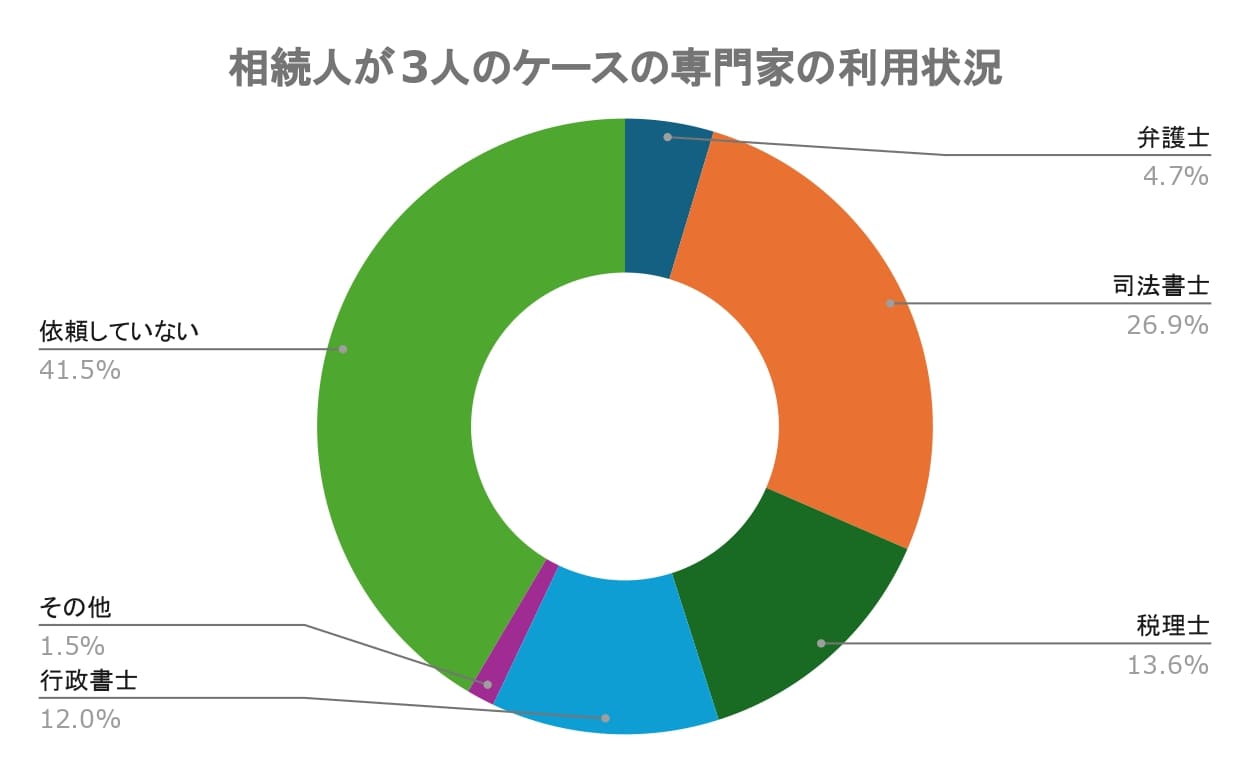 相続人が3人のケースでの専門家への依頼状況は、司法書士(26.9%)、税理士(13.6%)、行政書士(12.0%)の順で利用者が多く、弁護士はわずか4.7%でした。41.5%が専門家を依頼せずに手続きを完了していることがわかりました。