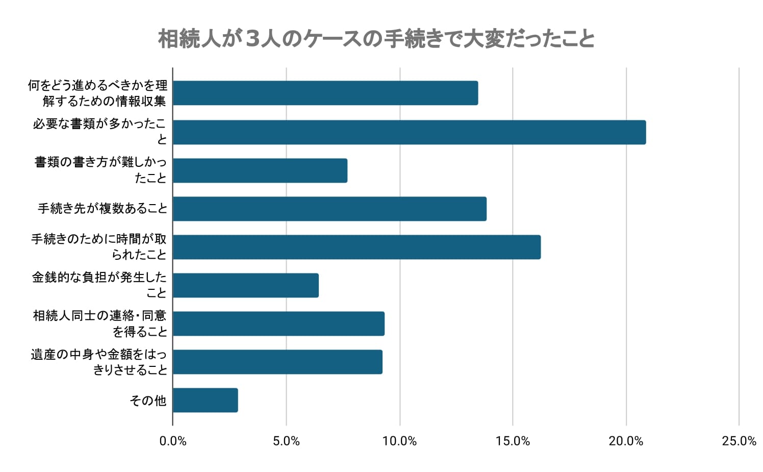 相続人が3人のケースの相続手続きで大変だったこととして、必要な書類が多かったこと(20.9%)、手続きのために時間が取られたこと(16.2%)、手続き先が複数あること(13.8%)が多く回答されました。何をどう進めるべきかを理解するための情報収集(13.5%)が大変だったと感じた人も比較的多い回答でした。相続人同士の連絡・同意を得ること(9.4%)や遺産の中身や金額をはっきりさせること(9.2%)など、相続人同士のやり取りや財産整理に関する苦労があったとの回答も一定数存在しました。