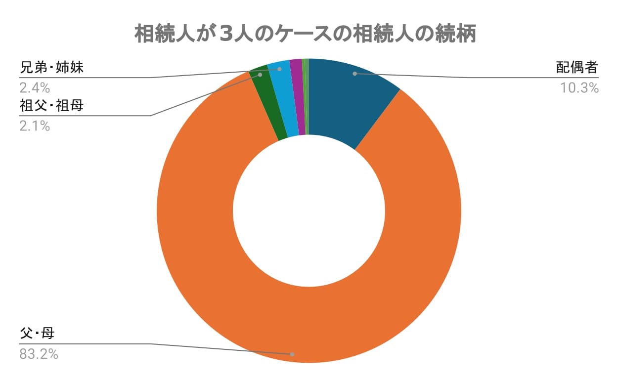 相続人の人数が3人の場合、最も多いのは「父・母」の相続であり83.21%を占めています。次に配偶者が亡くなって相続人が3人となるケース(10.25%)、兄弟・姉妹が亡くなったケース(2.38%)、祖父・祖母が亡くなったケース(2.08%)、叔父・叔母が亡くなったケース(1.34%)とという順番でした。