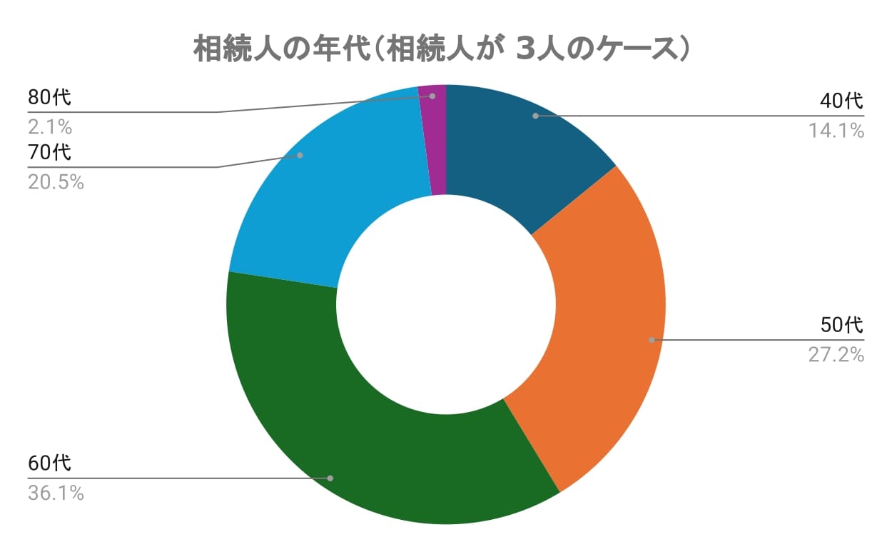 相続人が3人のケースにおいて、その相続人の年代分布は、60代(36.11%)が最も多く、50代(27.19%)、70代(20.51%)、40代(14.12%)と続きました。相続人が3人のケースにおいて相続が発生するのは主に50代~70代であることが分かります。80代以上(2.08%)は極めて少ないながらも存在し、親の寿命が長くなり、相続が発生するタイミングが後ろ倒しになっているためと考えられます。
