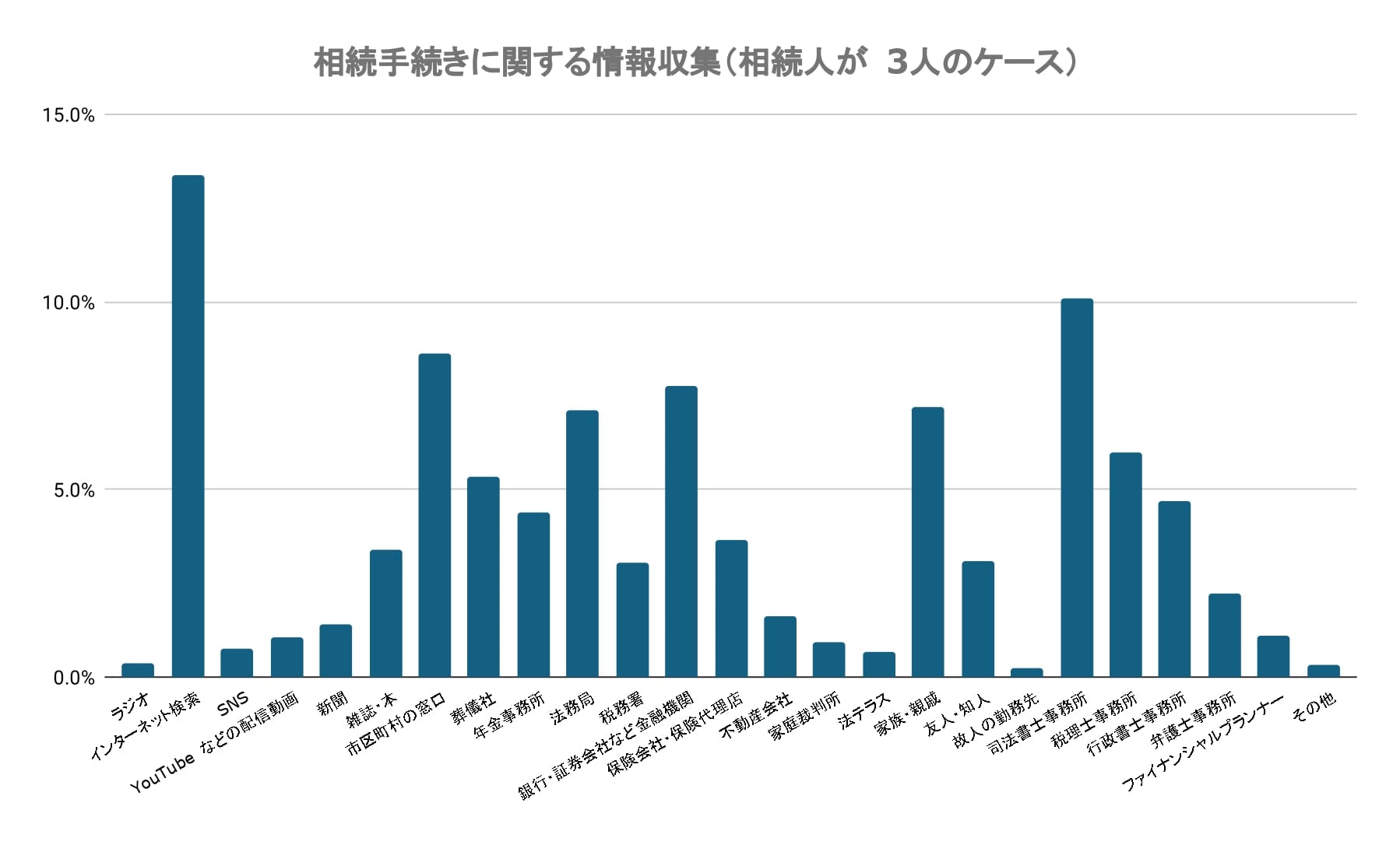 相続に利用した・役に立った情報源としては、インターネット検索(13.4%)が最も高い割合を占めていました。司法書士(10.1%)、市区町村の窓口(8.6%)、銀行・証券会社など金融機関(7.7%)、家族・親戚(7.2%)、法務局(7.1%)、税務署(6.0%)など、公的な機関やが専門家への相談も多いことがわかりました。葬儀社(5.3%)も利用されているため、葬儀から相続手続きの流れの中で自然と関与することが多いと考えられます。