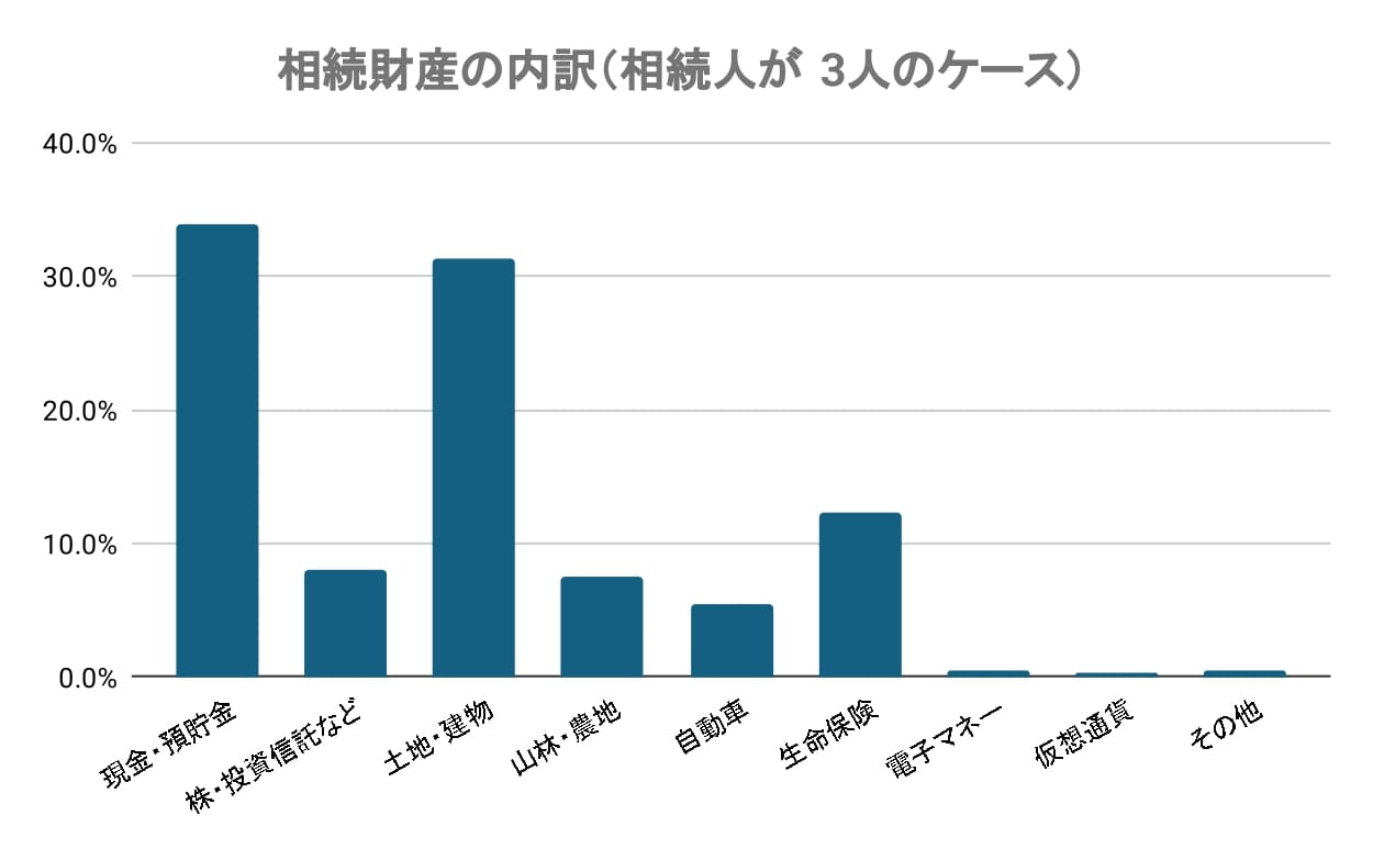 相続人が3人のケースでは、親の相続が最多で、相続人の多くは50代~70代。財産は1,000万~2,000万円が主流で、不動産と預貯金が中心、書類準備や手続きの煩雑さが負担に感じる傾向がありました。専門家へ手続きを依頼したは約6割で司法書士の利用が最多でした。