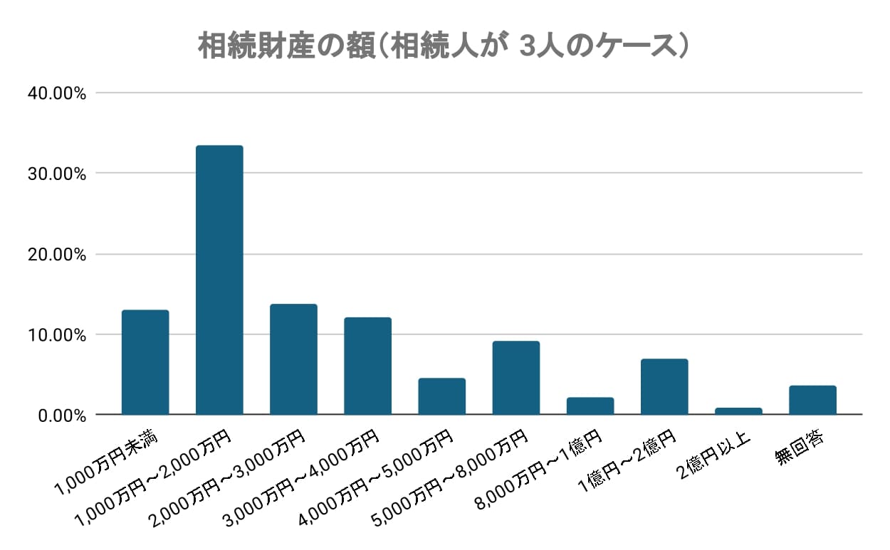 相続人が3人のケースの相続人の相続財産の額は、1,000万円~2,000万円(33.43%)が一番大きな割合を占めました。次に2,000万円~3,000万円(13.82%)、1,000万円未満(13.08%)、3,000万円~4,000万円(12.04%)がそれぞれ10%以上の割合でした相続税を意識する4,000万以上の財産額は全体の23%でした。