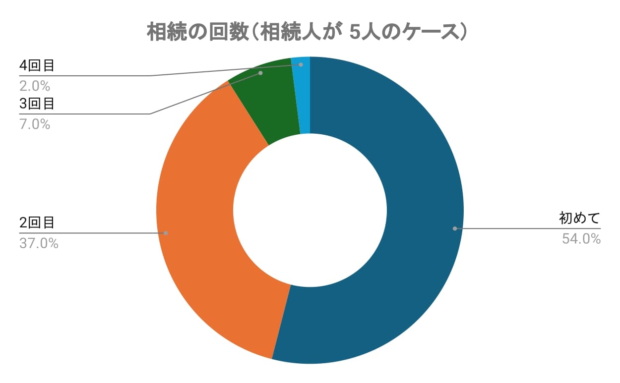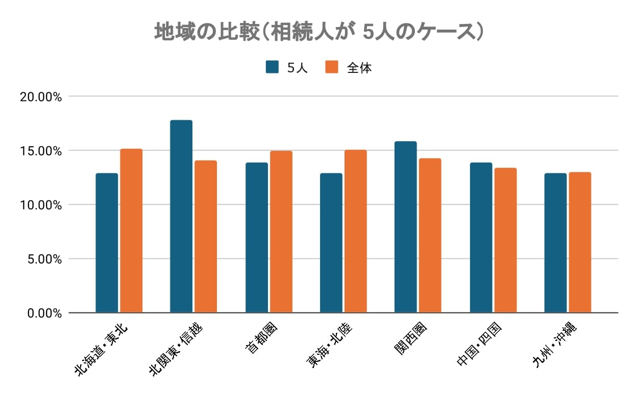 地域ごとに相続人が5人になるケースを比較すると、北関東・信越(17.82%)、関西圏(15.84%)に続き、首都圏(13.86%)、中国・四国(13.86%)が同率、次に東海・北陸(12.87%)、北海道・東北(12.87%)、九州・沖縄(12.87%)が同率でした。地域による偏りはあまりないことがわかりました。