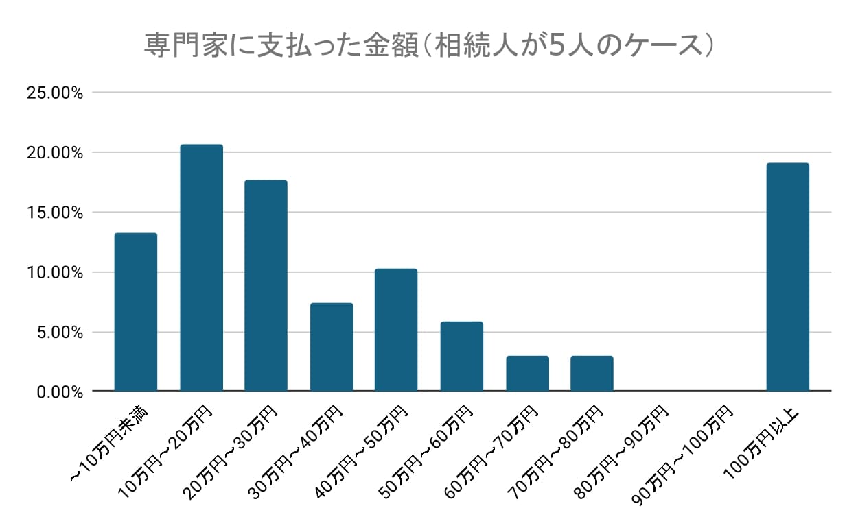 最も多いのが10万円~20万円(20.59%)、次に20万円~30万円(17.65%)、10万円未満(13.24%)と続き、約半数が30万円未満の支払いに収まっていました。100万円以上(19.12%)が一定割合存在しました。費用が高額になるのは相続税がかかる財産が多いケースや、不動産が複数ある場合、弁護士費用がかかる相続争いがあった場合と考えられます。