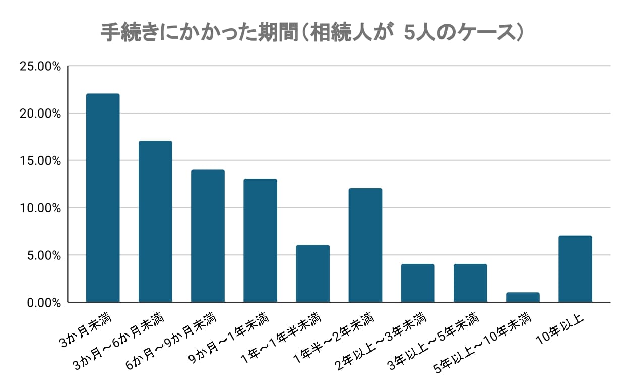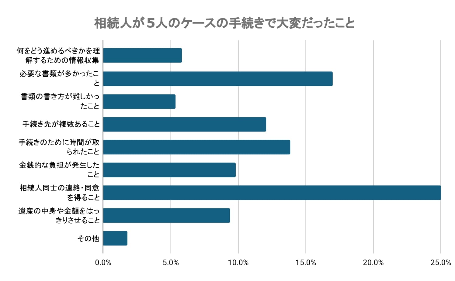相続人が5人のケースの相続手続きで大変だったこととして最も多かった回答が相続人同士の連絡・同意を得ること(25.0%)でした。遺産の中身や金額をはっきりさせること(9.4%)など、相続人の人数が多いことからやり取りや財産整理に関する苦労があったようです。必要な書類が多かったこと(17.0%)、手続きのために時間が取られたこと(13.8%)、手続き先が複数あること(12.1%)も多く回答されました。