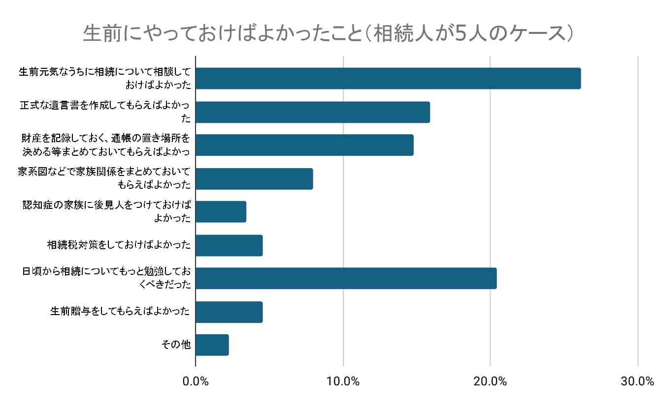 生前にやっておけばよかったこととして、生前元気なうちに相続について相談しておけばよかった(26.1%)、日頃から相続についてもっと勉強しておくべきだった(20.5%)が多い回答でした。正式な遺言書を作成してもらえばよかった(15.9%)、財産を記録しておく、通帳の置き場所を決める等まとめておいてもらえばよかった(14.8%)との回答も比較的多く回答がありました。財産管理や生前の対策が不十分だったと感じる人も多いようです。