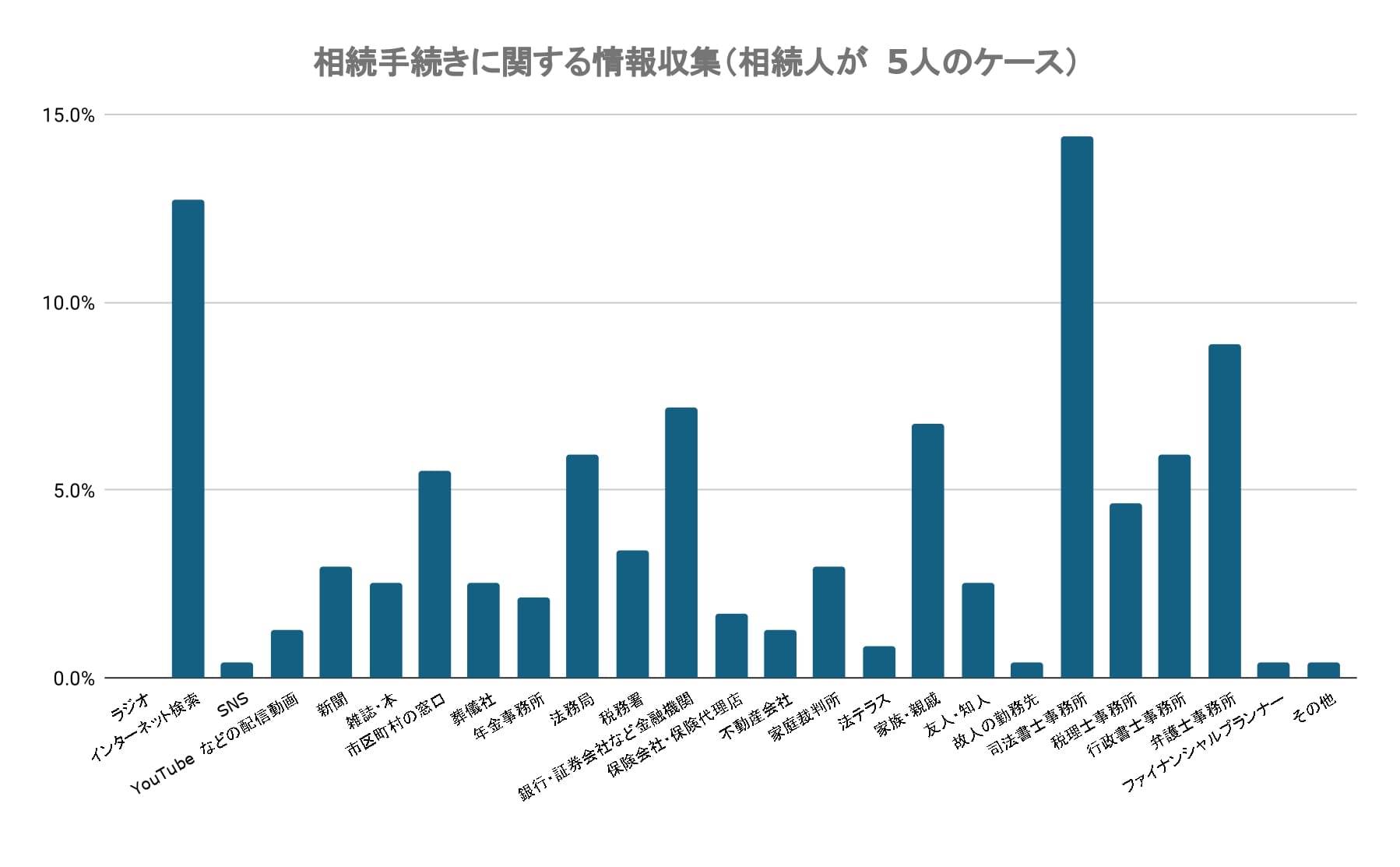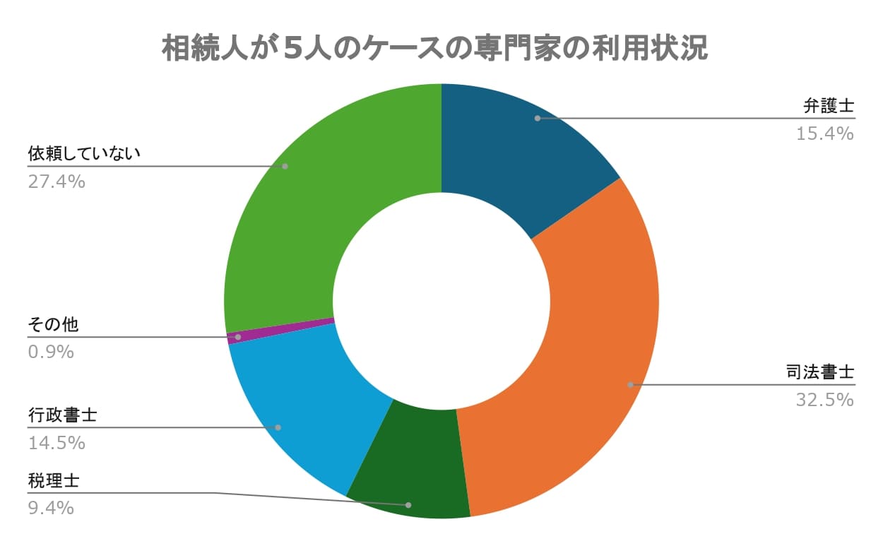 相続人が5人のケースでの専門家への依頼状況は、司法書士(32.5%)が最多、弁護士(15.4%)、行政書士(14.5%)、税理士(9.4%)の順でした。27.4%が専門家を依頼せずに手続きを完了していることがわかりました。
