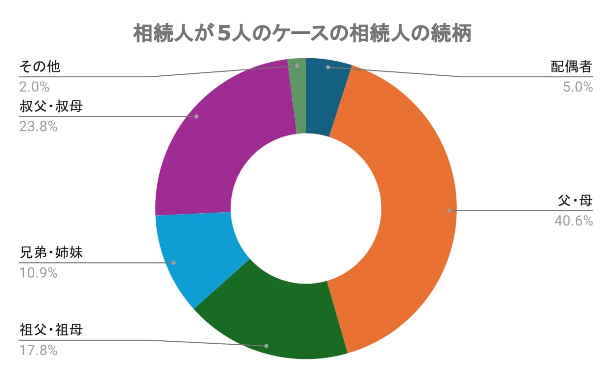 相続人の人数が5人の場合、最も多いのは「父・母」の相続であり40.59%を占めています。次に叔父・叔母が亡くなったケース(23.76%)、祖父・祖母が亡くなったケース(17.82%)、兄弟・姉妹が亡くなったケース(10.89%)、配偶者が亡くなって相続人が5人となるケース(4.95%)、という順番でした。