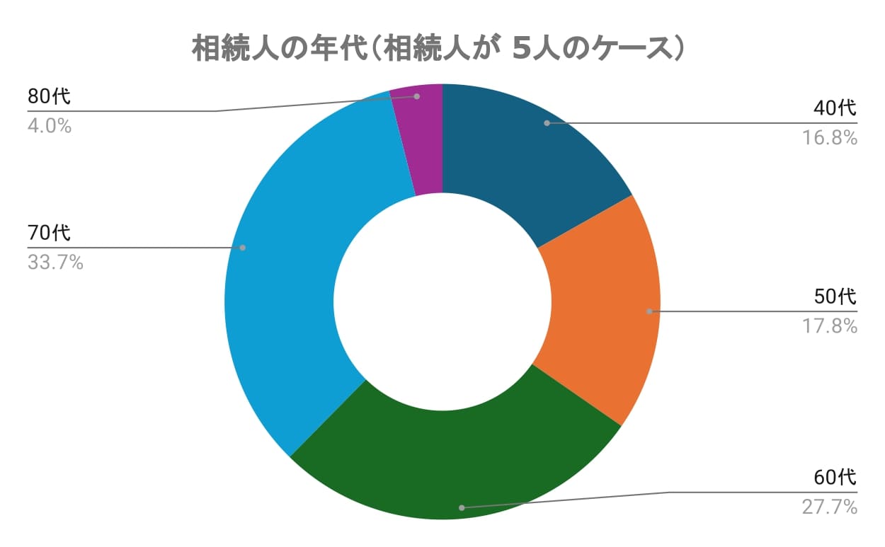 相続人が5人のケースにおいて、その相続人の年代分布は、70代(33.66%)が最も多く、60代(27.72%)、50代(17.82%)、40代(16.83%)と続きました。相続人が5人のケースにおいて相続が発生するのは主に60代~70代であることが分かります。80代以上(3.96%)は極めて少ないながらも存在しました。高齢の相続人がいる場合、二次相続までを考慮に入れているために相続人の数が多くなっている可能性が考えられます。