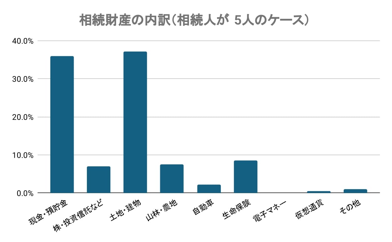 相続財産の種類は土地・建物(37.1%)と現金・預貯金(36.0%)が多く、この2つで約73%を占めます。生命保険(8.6%)、山林・農地(7.5%)、株・投資信託(7.0%)、自動車(2.2%)と続きました。
