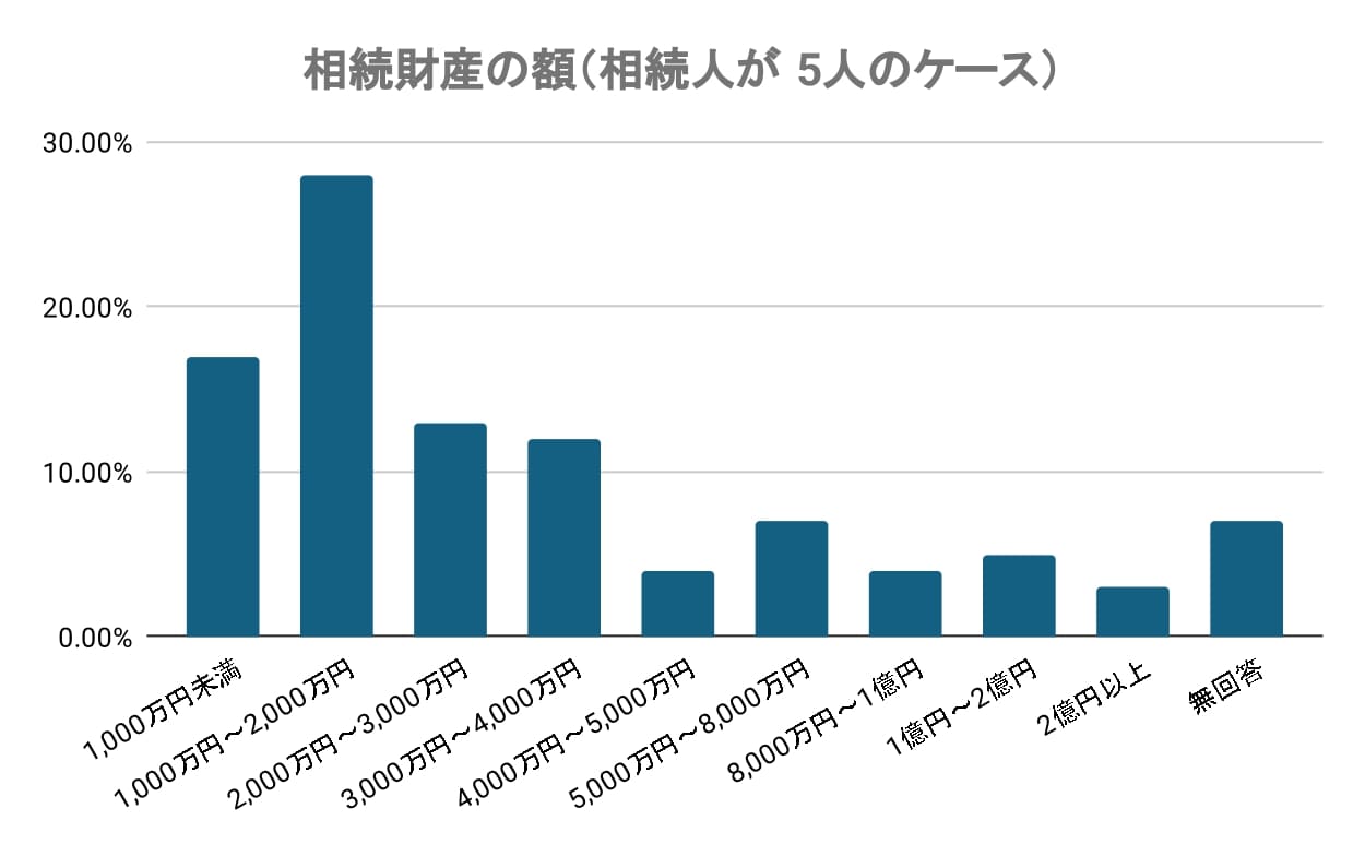 相続人が5人のケースの相続人の相続財産の額は、1,000万円~2,000万円(28.77%)が一番大きな割合を占めました。次に1,000万円未満(17.00%)、2,000万円~3,000万円(13.00%)、3,000万円~4,000万円(