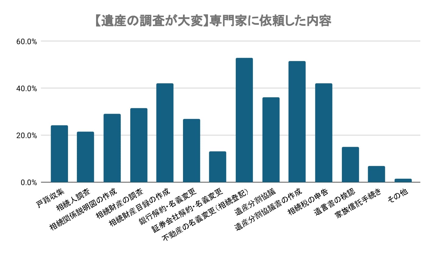 不動産の名義変更(53.0%)と遺産分割協議書の作成(51.6%)の依頼が最も多いことがわかりました。相続財産目録の作成(42.0%)や相続税の申告(42.0%)、相続財産の調査(31.5%)の依頼も多く、相続財産の全容把握や財産評価が難しい場合、専門家のサポートを利用しているようです。戸籍収集(24.2%)や銀行解約・名義変更(26.9%)は相続人自身で進めることも可能なため、比較的専門家への依頼が少ない傾向が見られました。※この設問は複数選択が可能なため、各回答の割合を合計すると100%を超えることがあります。
