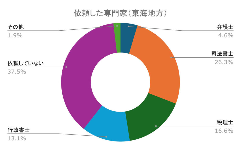 その一方、専門家に依頼していない割合は37.45%でした。したがって東海地方の6割以上が専門家に相続手続きを依頼したと言えます。