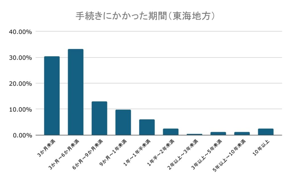 その一方、1年~1年半未満が6.07%、1年半~2年未満が2.43%、2年以上~3年未満が0.40%と、少数ではあるものの手続きが長期間にわたる場合も見られます。