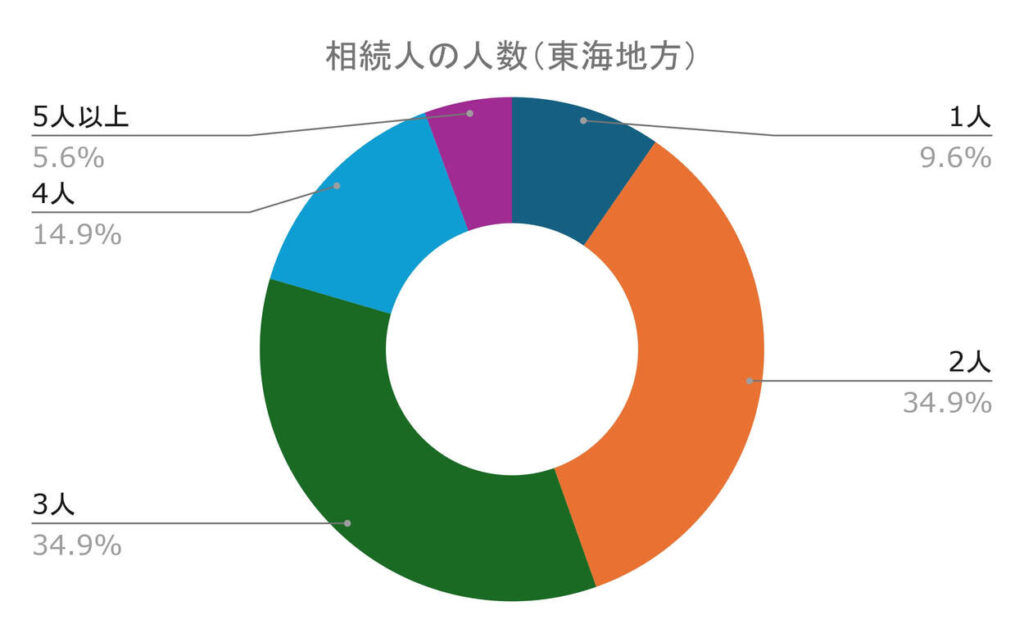 相続人3人と2人をあわせて69.88%と7割弱となることから、東海地方の相続において相続人は2~3人が一般的だと言えます。