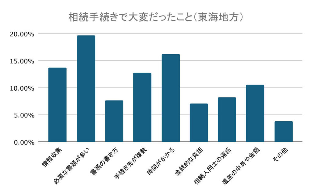 東海地方の相続で大変だったことという質問では、「必要な書類が多い」が19.74%と最多となりました。また「時間がかかる」が16.27%、「情報収集」が13.71%と続きます。
