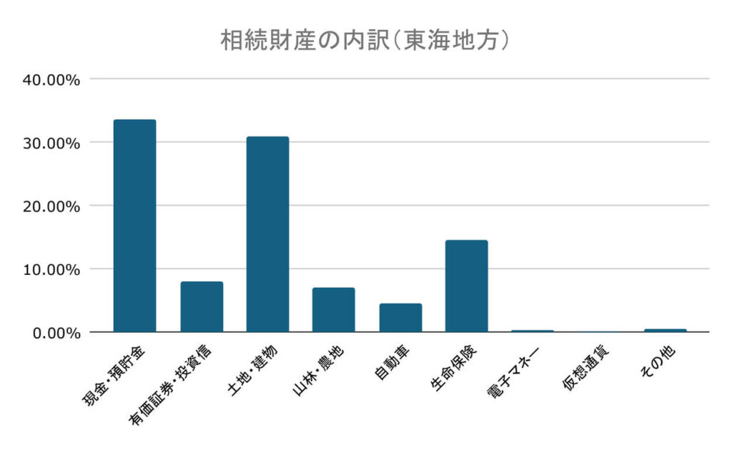 東海地方の相続の相続財産内訳は現金・預貯金が33.58%と最多、次いで土地・建物が31.02%でした。