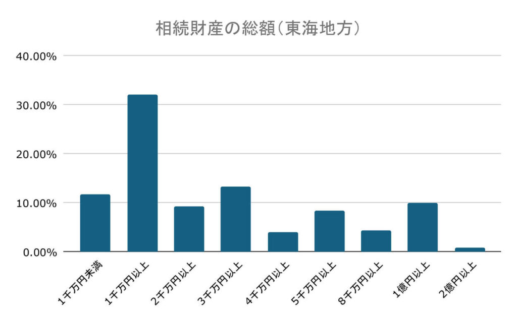 東海地方に住む人の相続では相続財産の総額が1,000万円以上~2,000万円未満が最多で、32.13%となりました。