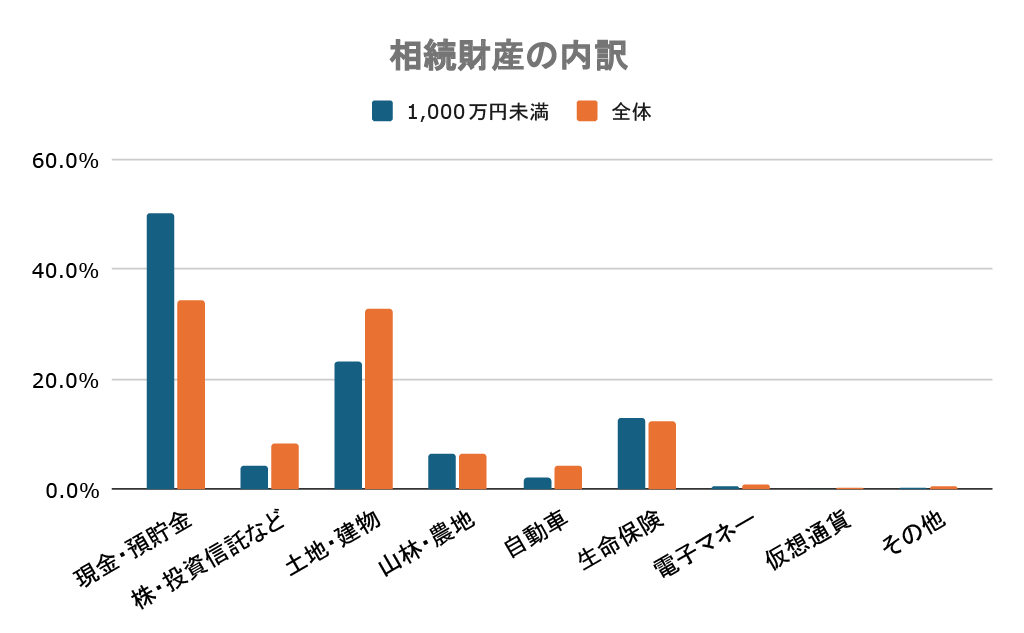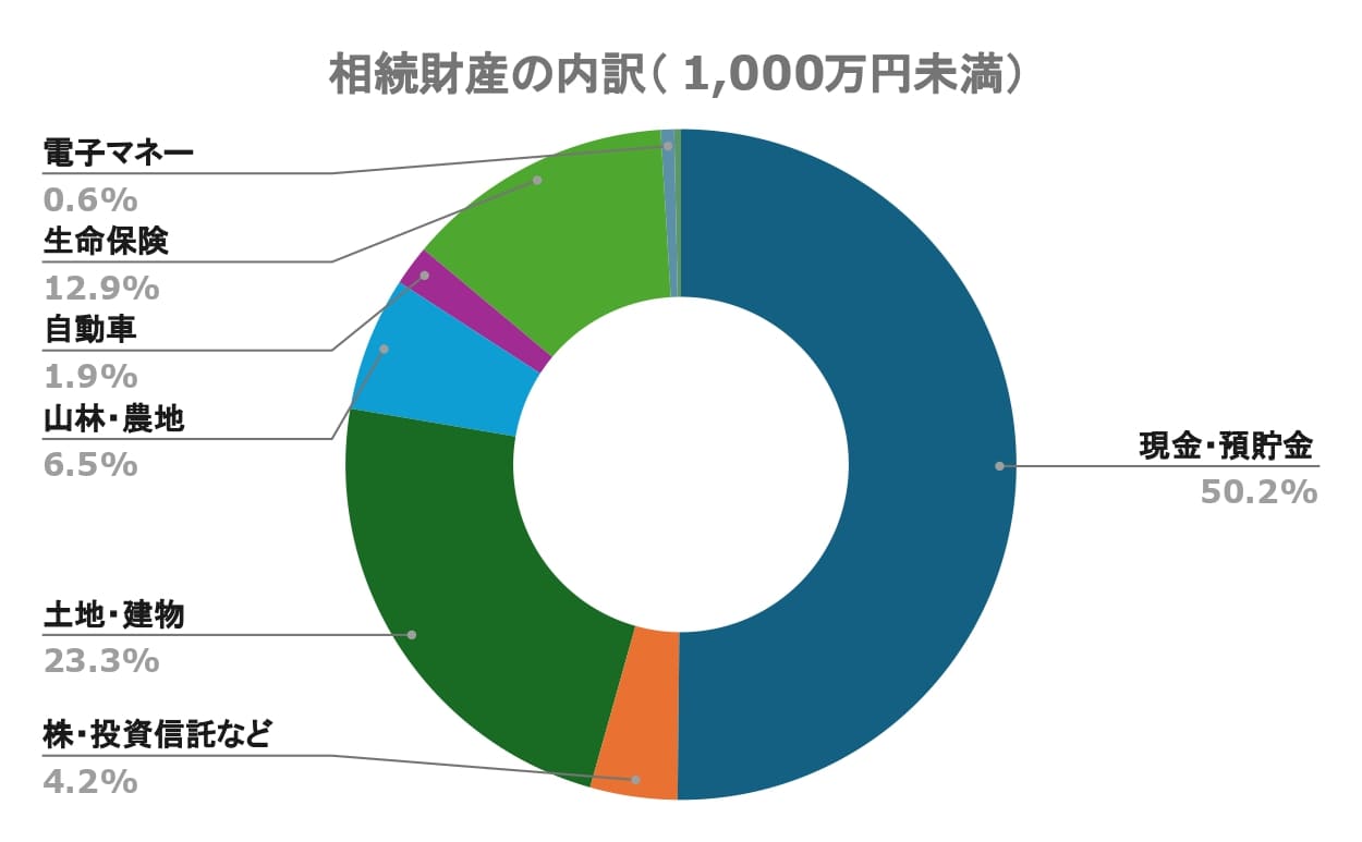 相続財産1,000万円未満の場合は、現金・預貯金が50.2%と最も多い理由は流動性の高い資産が中心となる傾向があるためと考えられます。