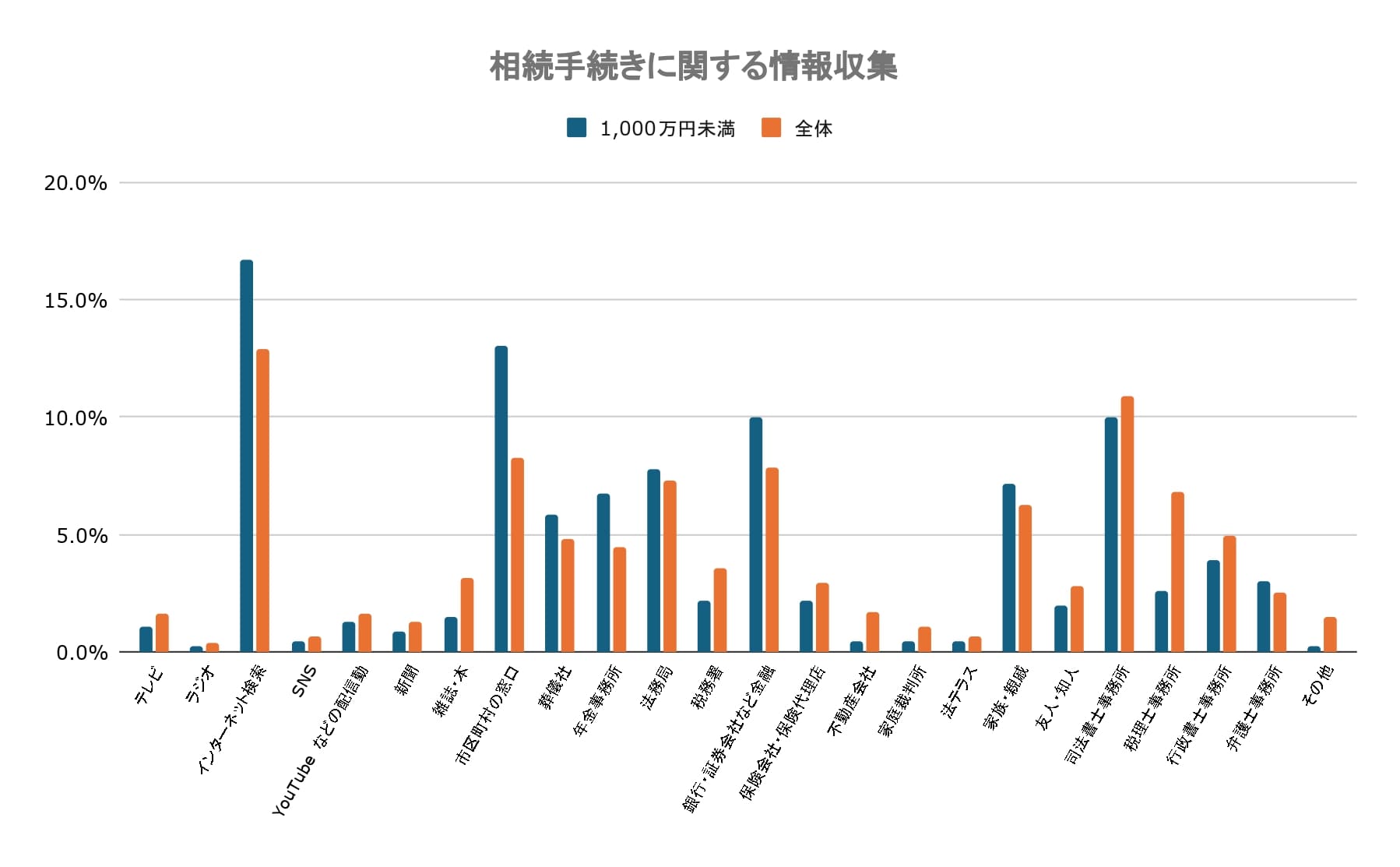 一方、利用割合が低い情報源は税理士事務所や弁護士事務所などでした。これは相続税申告が不要であることや遺産争いが少なかったことが考えられます。