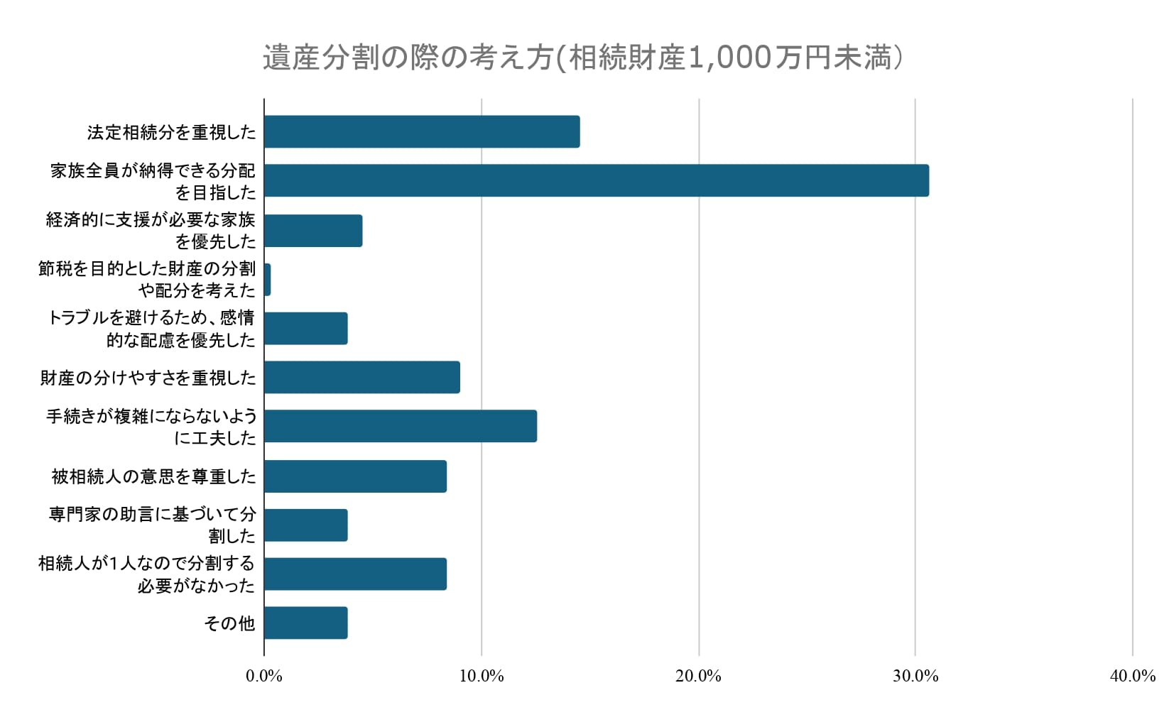 遺産の分け方については、家族全員が納得できる分配を目指したという回答は30.6%と割合が高く、財産が少額の場合、財産の種類が少ないこと、また相続人の間でトラブルになることが少なく、家族間での共有や話し合いがスムーズであることが伺えます。